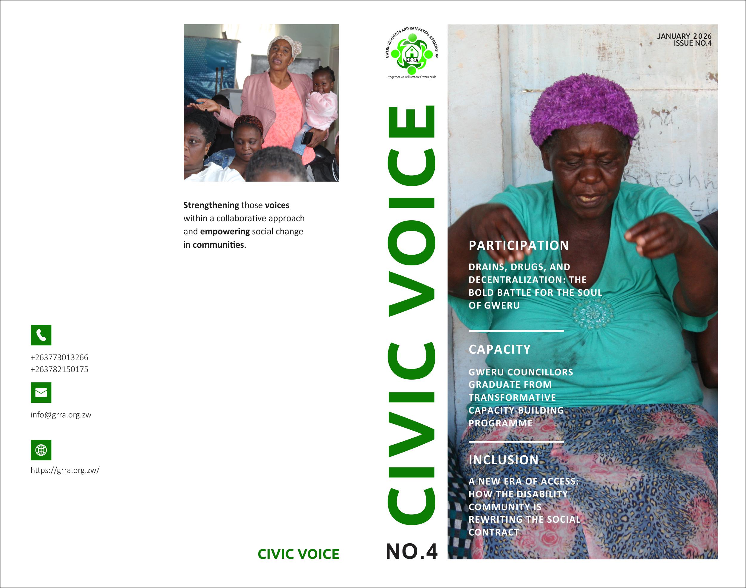 The magazine details the Gweru Residents and Ratepayers Association’s (GRRA) strategic efforts to boost citizen participation and accountability in Gweru and Vungu. Key initiatives include the Engagement for Progress Model (E4P), which uses digital and in-person forums to connect over 23,500 residents with duty bearers. Highlights include the launch of Gweru’s first **Disability Desk** to empower rightsholders, a **capacity-building programme** for Gweru Councillors, successful advocacy that fueled the revival of **Go Beer Breweries**, and community-led solutions for water scarcity and disaster risk reduction. The GRRA is also actively combating **drug and substance abuse** through youth-focused sport and school outreach. https://drive.google.com/file/d/1n478mB1AbvfX6WClTxZZfNhndZXmraWE/view?usp=sharing